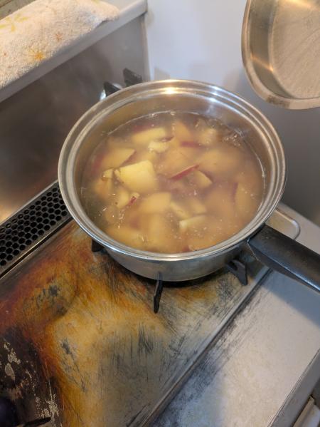 そんなことで、サツマイモがたくさんある。でかいサツマイモ1本を全部切って、鍋に入れたら、具がサツマイモだけになってしまった。