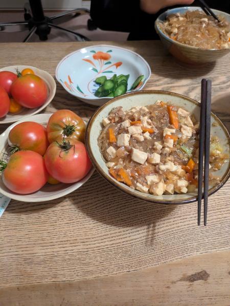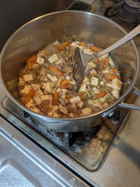 あと、昨日の余ったひき肉、豆腐を使わねば、ということで、全部入れて炒めたが、余りものなので、少ない。翌日の弁当分にもせねばならないので、増やさねばと、ハルサメを入れる(ハルサメをを戻すのに鍋をさらに使うのはちょっと嫌だが)