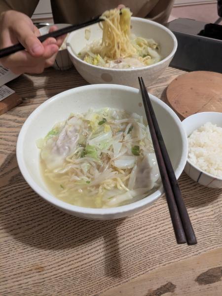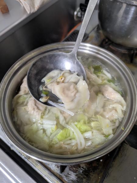 昨日の、包まない小籠包で使った餃子の皮が余ったので、ひき肉だけ入れて、ワンタンにしてラーメンに入れる。