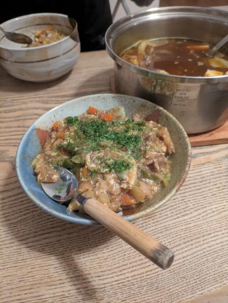 昨日の汁ものがあるので、それに今日買った豆腐を入れ、残りのキャベツを入れ、具材を増やし、水も増やし、汁ものを再利用。