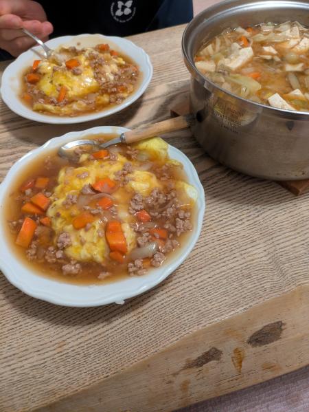 今度は天津飯のあんかけスープ作りすぎたと次男