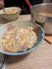 鶏肉を小さく刻んだ親子丼昨日の鶏肉の1ト....